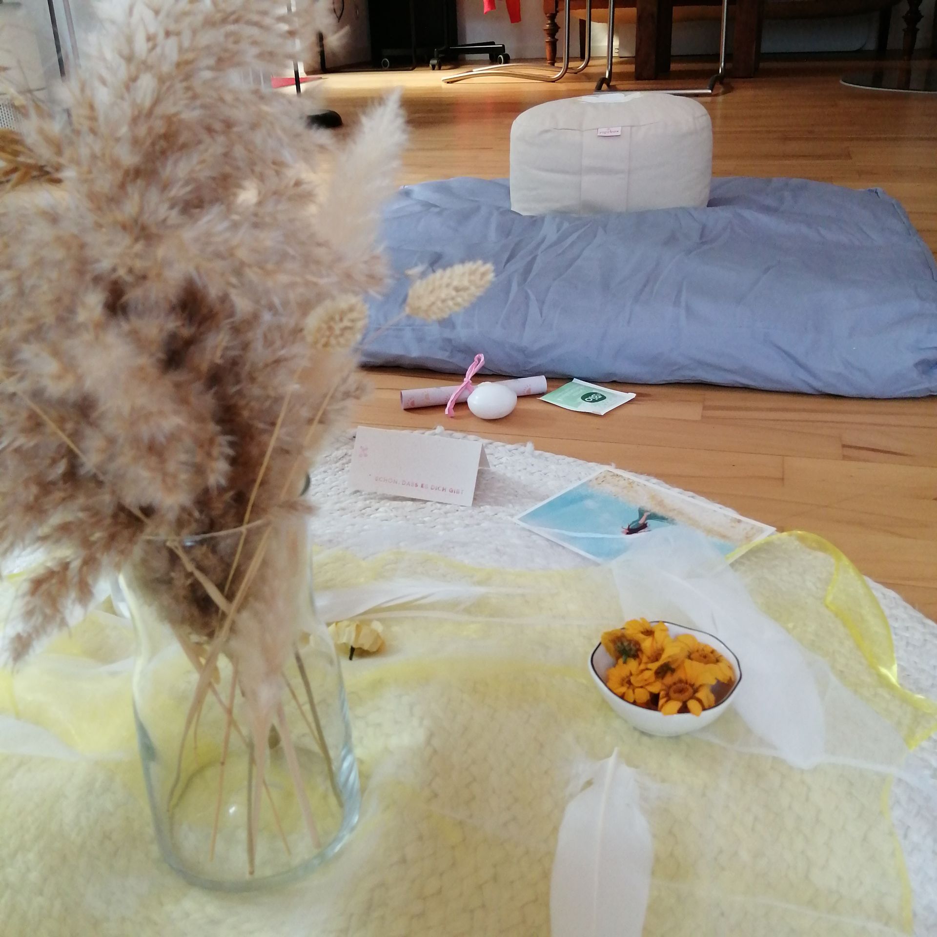 ist diesmal mit weißen Federn und Organza, Blüten und kleinen Trockenblumen dekoriert. Du sollst Dich gleich beim Betreten des Raumes wohlfühlen. Sitzmatten und Meditationskissen machen den Kreis noch größer und runder. Nun bist Du da und kannst mit dem Lied von Gregor Meyle "Leichtigkeit des Seins" erstmal aufatmen, loslassen, entspannen.