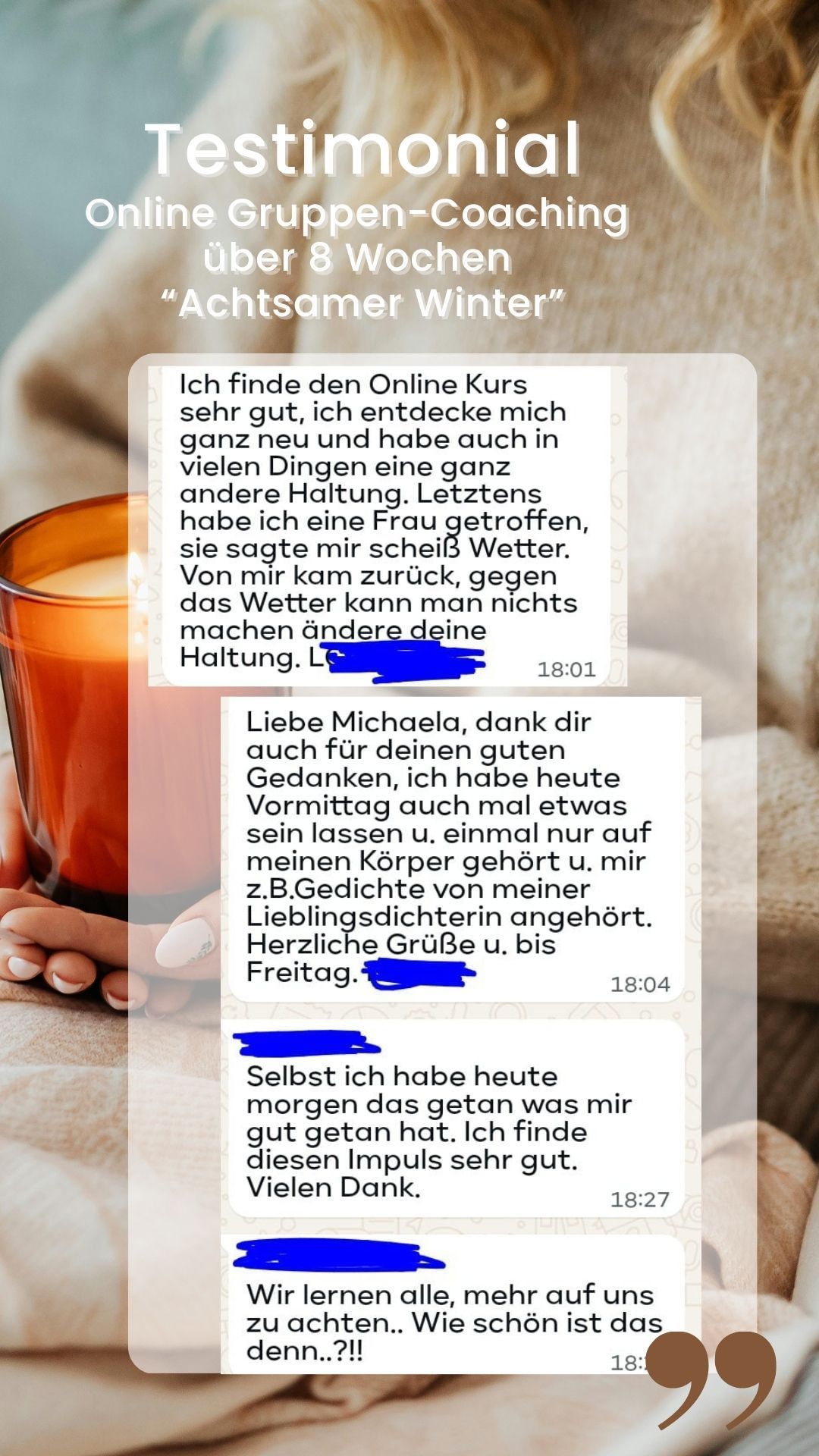 Online Gruppen Coaching "Achtsamer Winter - Gelassen & leicht durch die dunkle Jahreszeit". Ein Programm über 8 Wochen (Okt-Dez 25). Schön wars!!