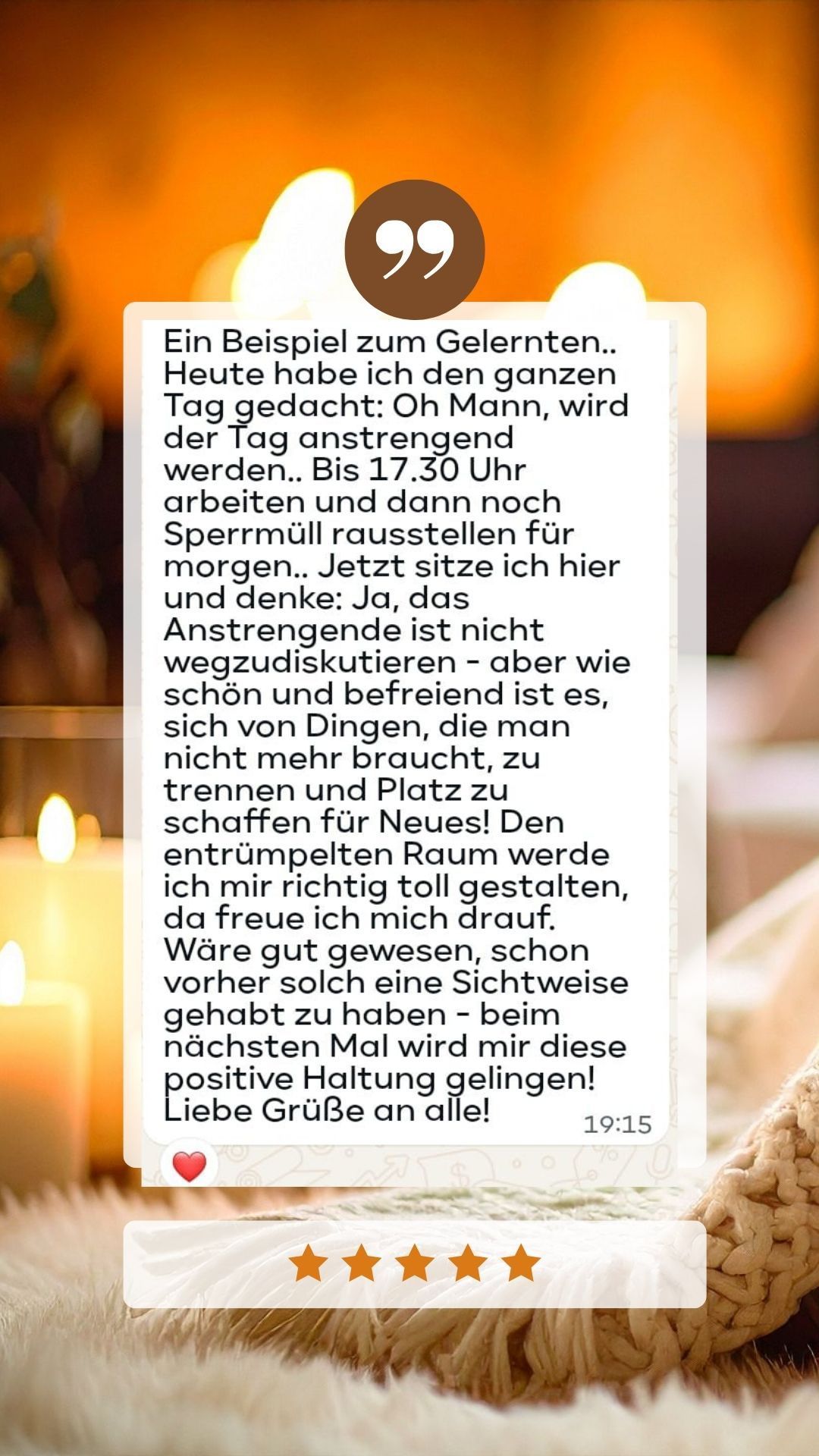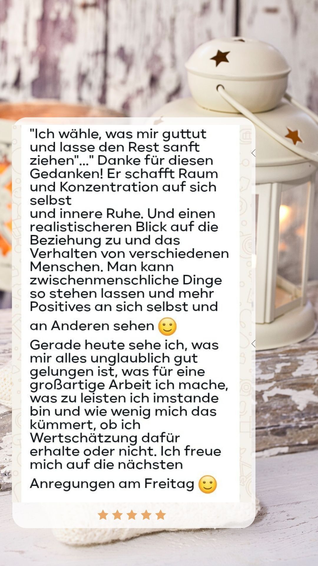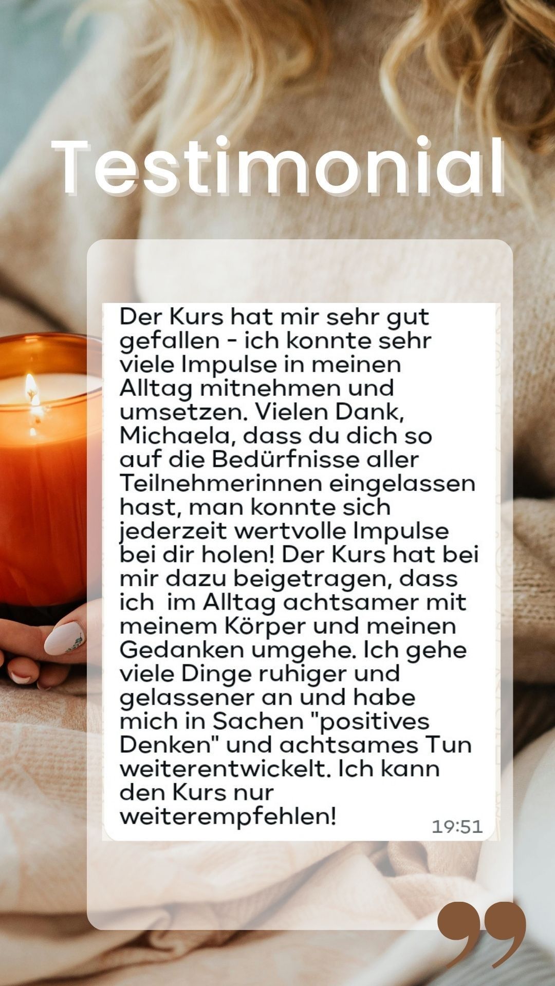Mein Training war inkl.: WhatsApp Gruppe, digitales beschreibbares Handout mit viel Platz für Gedanken & Notizen und Meditationen nach jedem Treffen, Wochenimpuls immer montags.