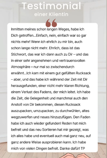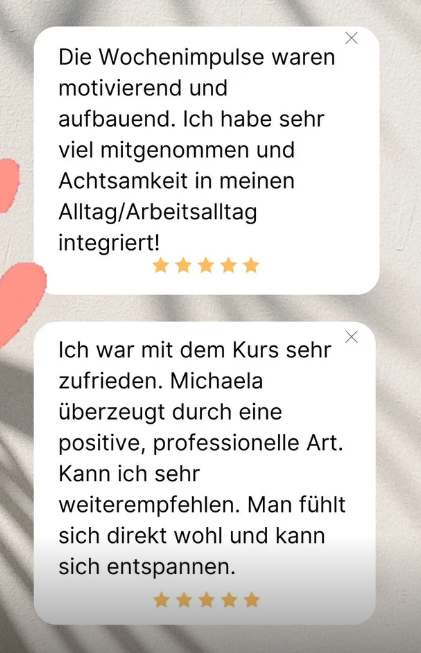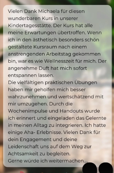Eine sehr angenehme und interessierte Gruppe, die auch tatsächlich in die Umsetzung ging. Mein Training war inkl.: Handout nach jedem Treffen in Papierform, Meditation elektronisch (MP3), WhatsApp Gruppe mit wöchentlichen Impulsen.